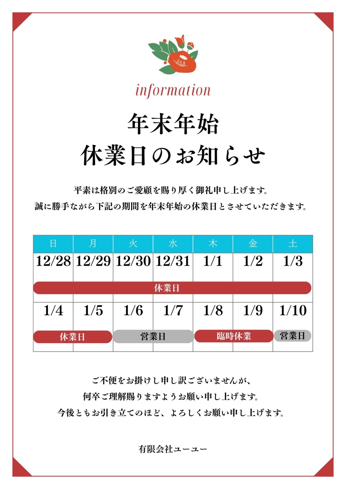 2025年12月23日(火) お知らせ 年末年始休業体制のお知らせ お客様各位 年末年始休業体制についてお知らせ申し上げます。 2025年12月28日(日)~2026年1月5日(月)まで 年末年始休業とさせていただきます。 なお、2026年1月8日(木)、1月9日(金)は研修により臨時休業とさせていただきます。 期間中は何かとご迷惑をおかけいたしますが、 何卒ご了承のほど、お願い申し上げます。